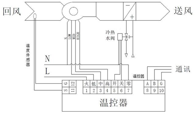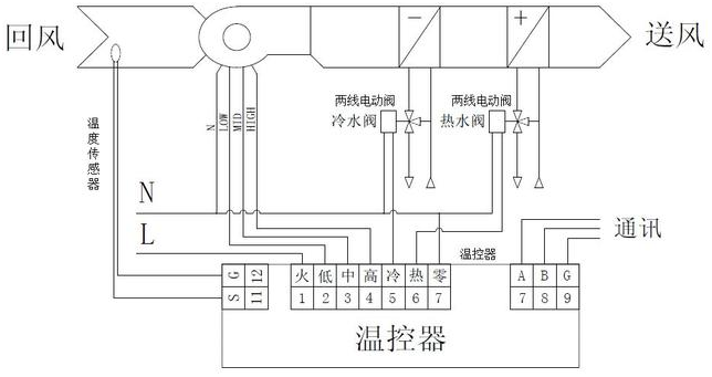 四管系統(tǒng)包括兩個(gè)獨(dú)立的冷卻水和熱水熱交換裝置。冷水閥系統(tǒng)打開(kāi)用于冷卻,熱水閥系統(tǒng)打開(kāi)用于加熱。溫度控制器實(shí)時(shí)檢測(cè)室溫并將其與設(shè)定溫度進(jìn)行比較,根據(jù)比較結(jié)果控制電動(dòng)閥的開(kāi)關(guān),從而保持室溫處于穩(wěn)態(tài)。