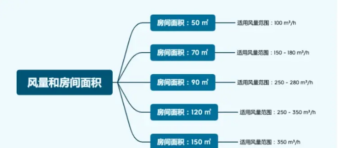 一般臥室按 50 平米以內(nèi)來算的話,得要至少 100 風(fēng)量的機(jī)子,150 - 180 風(fēng)量大概可以覆蓋 70 平米以內(nèi)的面積,以此類推,具體標(biāo)準(zhǔn)可以參考這個(gè)圖。