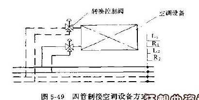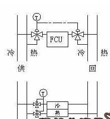 四條管道分別采用冷熱水供應(yīng)管和回水管系統(tǒng)。進(jìn)出水管設(shè)轉(zhuǎn)換控制閥,主要用于全年空調(diào)系統(tǒng),即隨時(shí)有冷熱源,冷熱水量由溫控閥調(diào)節(jié)。